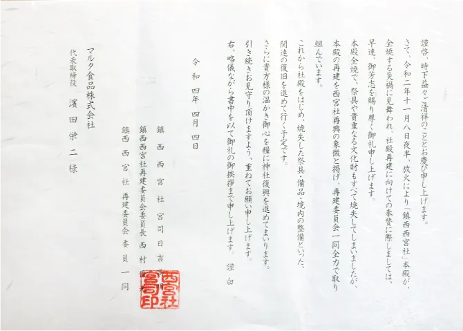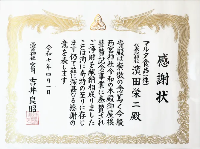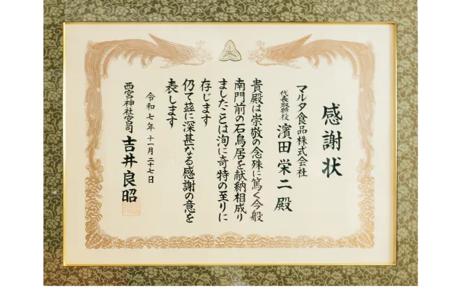 マルタ食品創業当初より、厚く信仰させていただいている伏見稲荷大社様より、表彰状を頂戴いたしました。